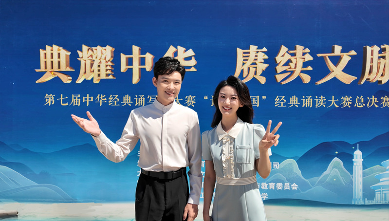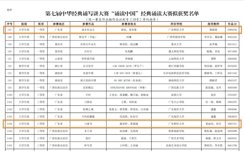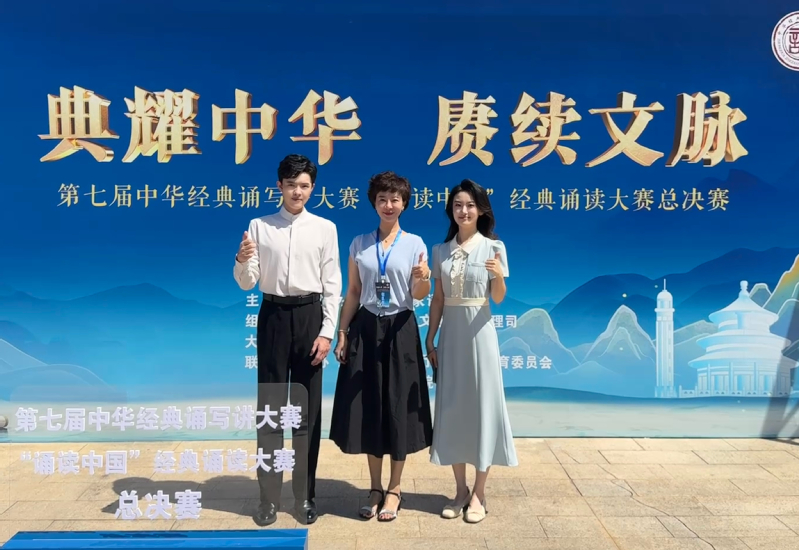 近日,由教育部、国家语委主办的第七届中华经典诵写讲大赛“诵读中国”经典诵读大赛总决赛获奖名单正式公布。由广东财经大学湾区影视产业学院主持表演系主任郭丽莉老师指导,2023级艺术(广播电视)专业学位硕士研究生裴钰、姜世豪同学朗诵的作品《故乡在远方》,凭借深情饱满的艺术表达与精湛细腻的舞台呈现,荣获大学生组全国一等奖;由易油均、田丰老师指导,2023级播音与主持艺术专业1班施星伊、黄嘉超同学诵读的《与妻书》荣获大学生组全国三等奖。同时,郭丽莉老师荣获“优秀指导教师奖”。
